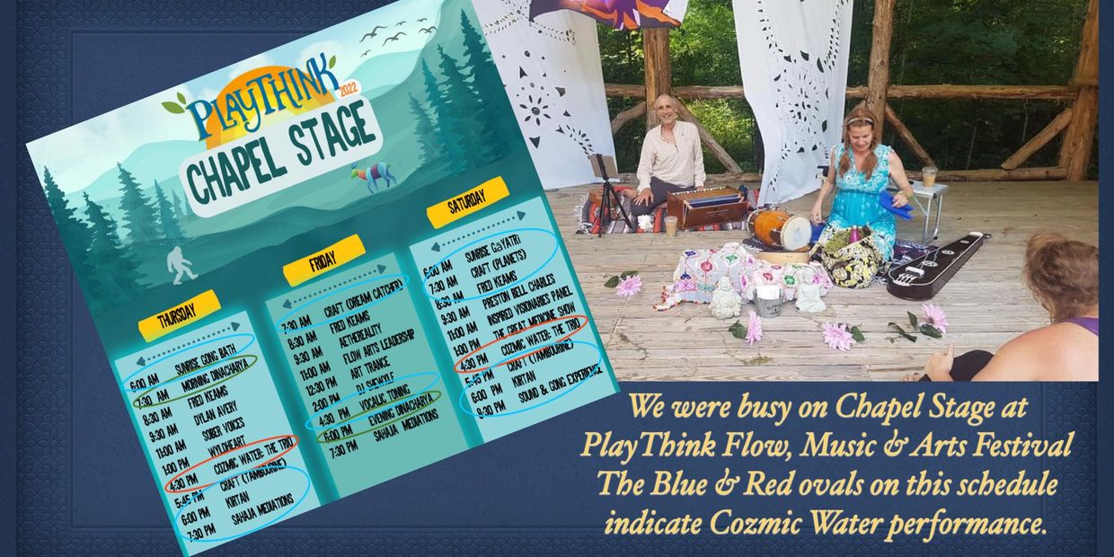 Tara then began to write insightful and beautiful songs that we incorporated into our yoga teaching and workshop practices. Looking to share these sonic pearls we became fully engaged in producing and recording our music during the co-vid pandemic and to begin bringing it to a wider live audience. We spent most of 2021 creating of "Following the Moon" album released in January 2022; and released our second album "Somatic Sojourns" in early Spring of 2023, all while Tara was being diagnosed and treated for ocular cancer. During this time, we also invited our friend, Mark Smith, to join us recording and at times performing with us. Since then Cozmic Water has appeared at several Festivals and are currently in the process of releasing 10 new pieces!