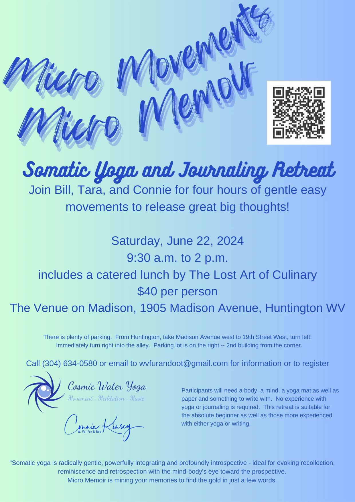 Somatic yoga is radically gentle, powerfully integrating and profoundly introspective – ideal for evoking recollection, reminiscence and retrospection with the mind-body’s eye toward the prospective. Micro Memoir is mining your memories to find the gold in just a few words.